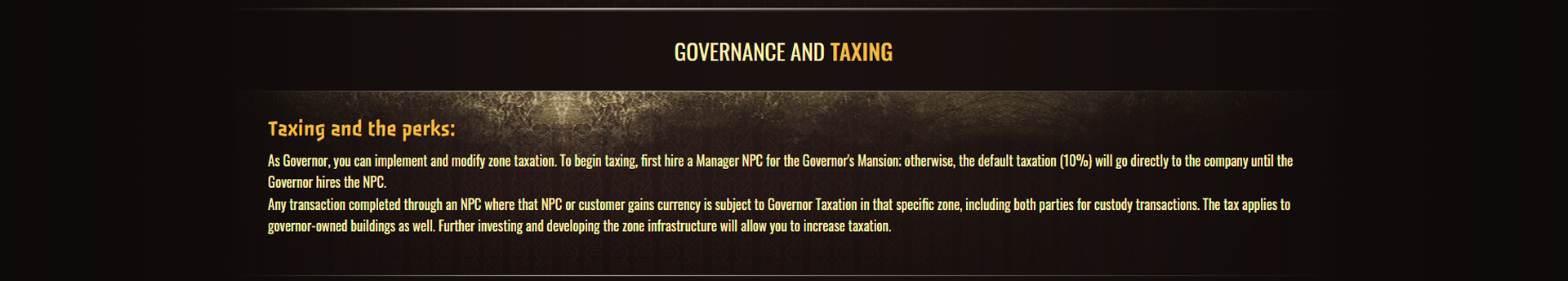 Being essential to the zone, a Governor affects the infrastructure. If merchant building cannot meet the consumer demands of other players or when the market is overwhelmed with products from the same business, it falls to the Governor to balance this out. Taxes and fees in the area are controlled and collected by the Governor. The sum of those taxes and fees gets divided between the Governor and the Company. These specific rules include, but are not limited to: